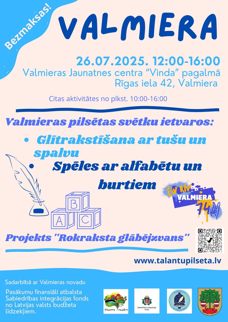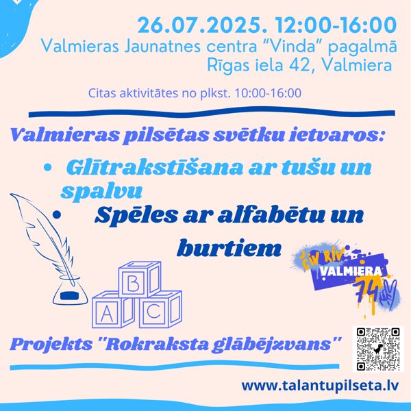 Projekta ietvaros 2025. gada vasarā organizējām radošās aktivitātes bērniem, kur bija pieejamas glītrakstīšanas radošā darbnīcas un spēles ar alfabētu, burtiem.Aktivitāte ir noslēgusies- paldies visiem par dalību!