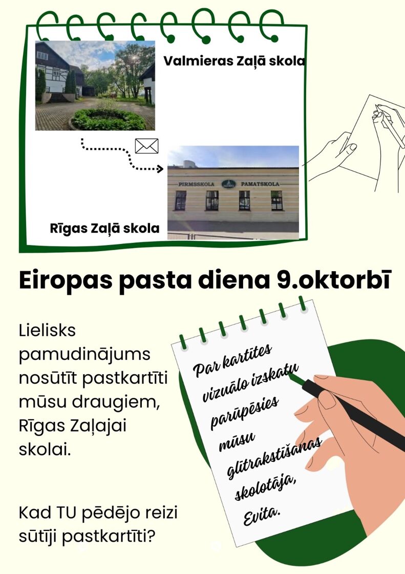 Pasaules pasta dienā atcerējās, cik svarīgi ir sazināties un saglabāt draudzības saites arī ārpus ekrāna! Valmiera Zaļās skolas skolēni izveidoja radošas, glīti rakstītas pastkartītes, ko nosūtīja saviem draugiem-  Rīgas Zaļajai skolai. Ar siltām domām un labiem vārdiem palīdzēja dalīties glītrakstīšanas vēstnesis  Inga Grīnbauma.
