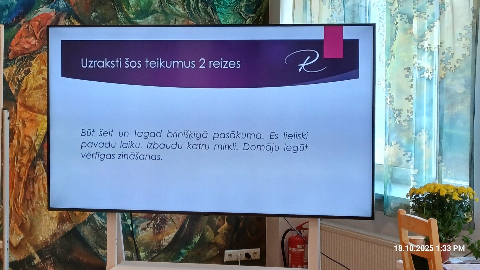 Nosēdzot pasākumu Siguldā (18.10.2025), Siguldas pagasta kultūras centrā visām projekta dalībniecēm atkal bija iespēja satikties un zelta rudens noskaņās iedvesmoties- ielūkojāmies prezentācijā par projekta laikā paveikto un pakavējāmies jaukajās norises atmiņās, sarīkojām nelielu zibakciju "spītnieku savaldīšana" ar kuru vēlējāmies vēlreiz un vēlreiz uzsvērt to, cik ļoti mūsu bērni ir dažādi- kāds lēns, kāds bailīgs, kāds pikts (paldies brīvprātīgajām aktrisītēm Dārtai, Austrai un Tīnai) un cik talantīgas ir mūsu skolotājas, kas prot atrast pieeju ikvienam bērnam, lai iedvesmotu rakstīt un mācīties!